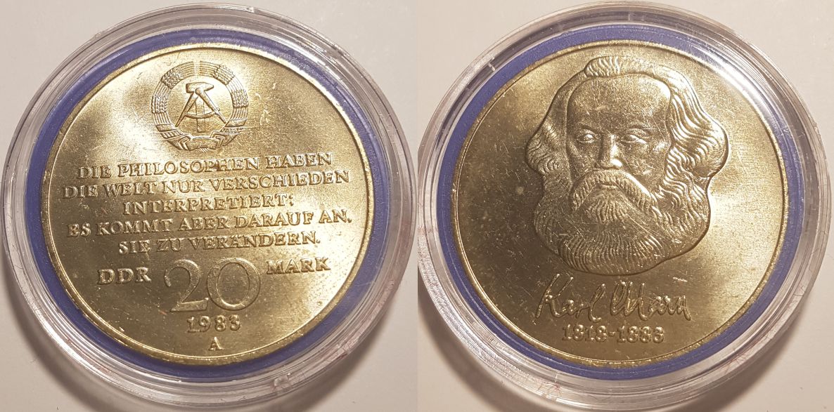 20 Mark 1983 DDR Karl Marx stErhaltung: (st)Material: Kupfer-NickelGewicht: 15,10 gDurchmesser: 33,00 mmAuflage: 1.000.000